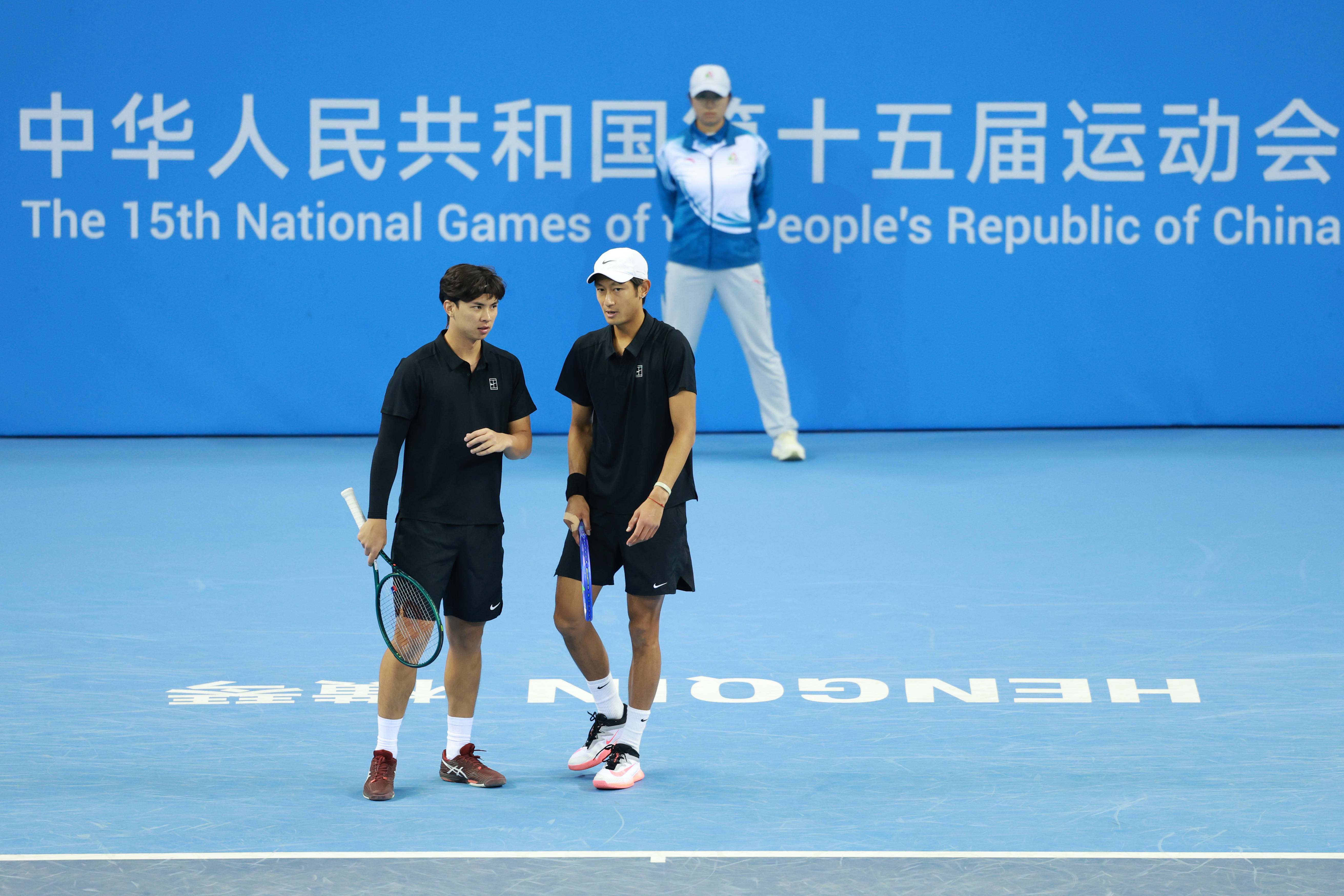 当日,第十五届全国运动会网球项目男子双打决赛在广东横琴举行。浙江队组合布云朝克特/郑展对阵江苏队组合唐盛/孙浅。