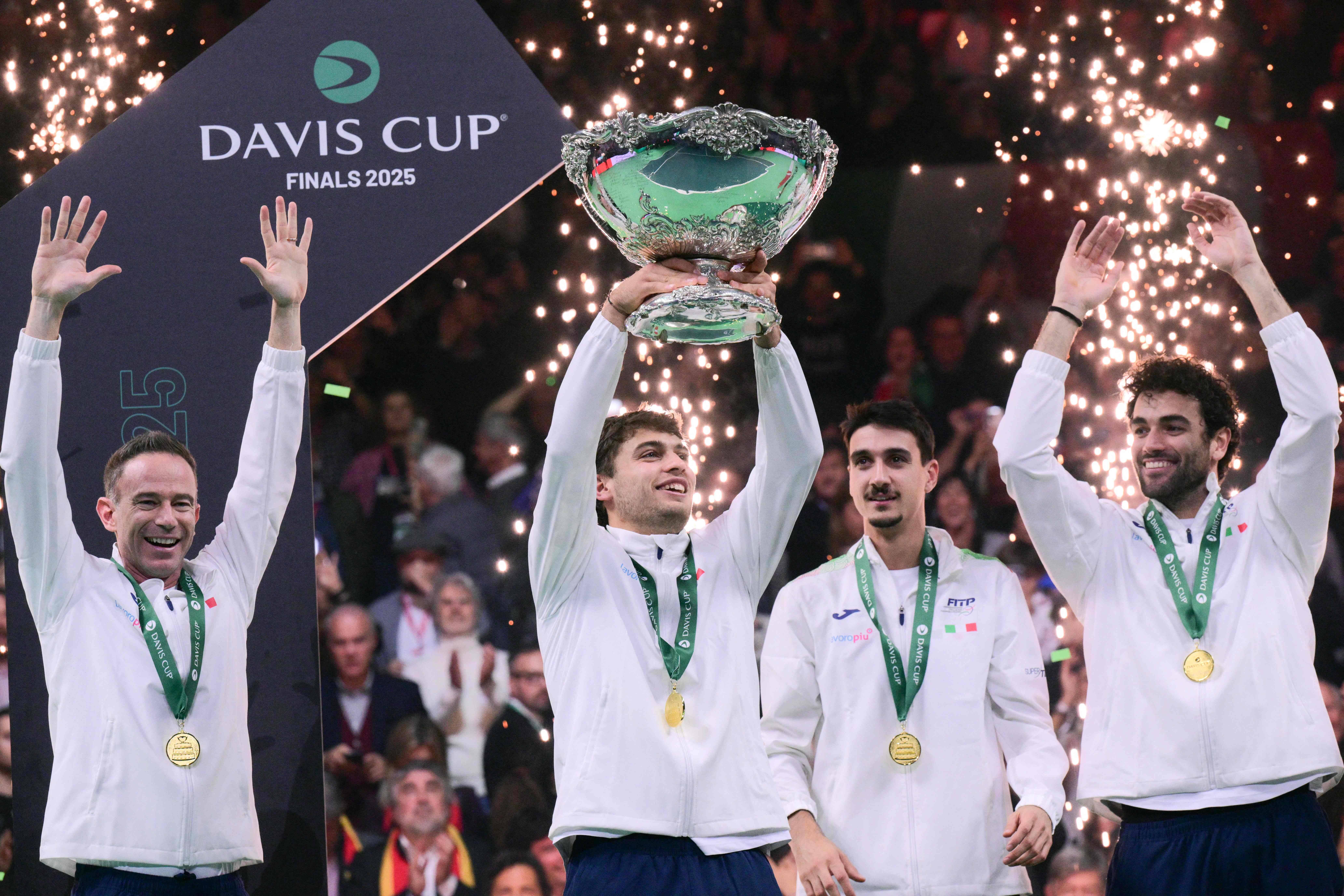 当日,在意大利博洛尼亚举行的2025年戴维斯杯网球赛团体赛中,意大利队2比0战胜西班牙队,夺得冠军。